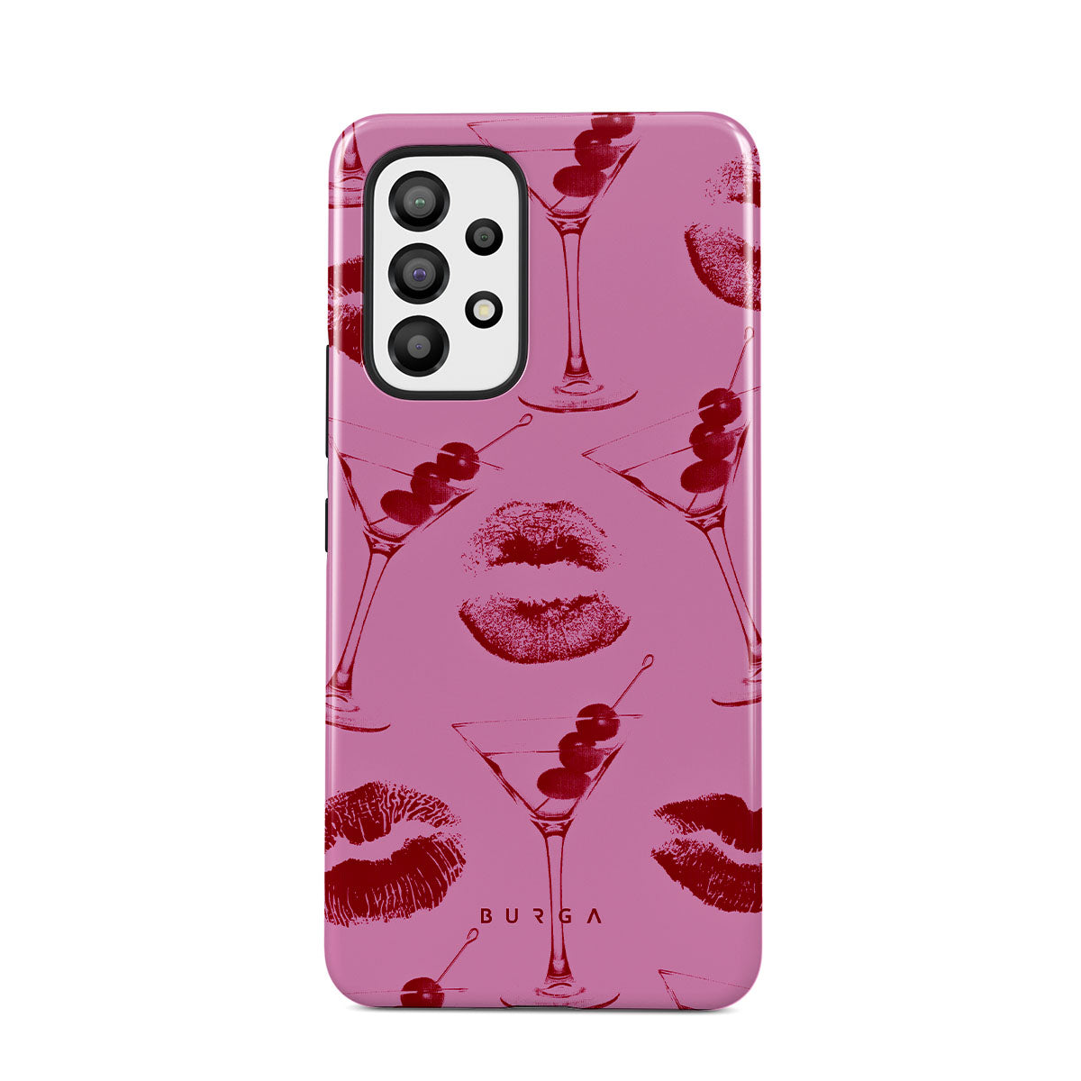 Kenmerken van dit ontwerp: rode lippen, kussen, cocktailglazen, martini's.