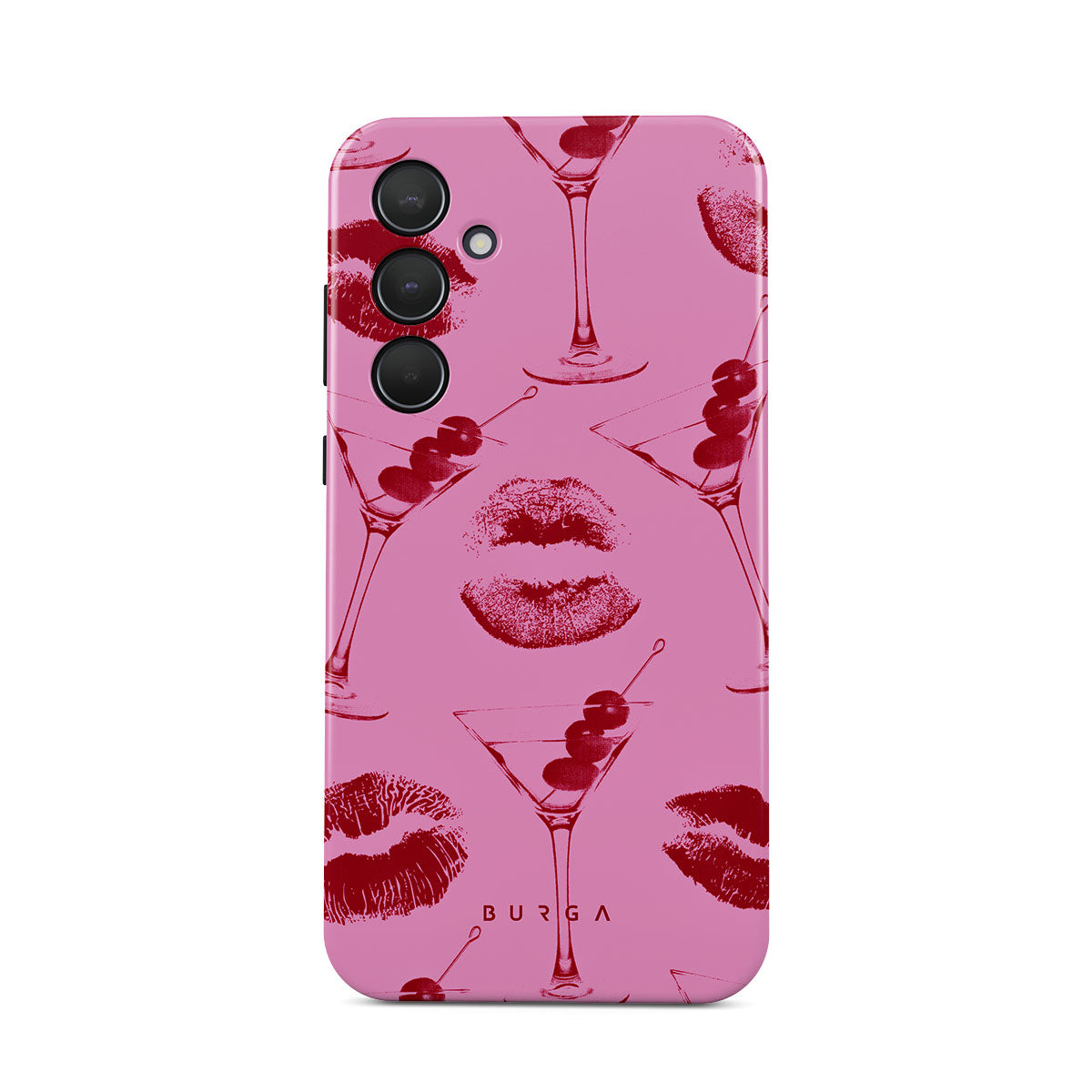 Kenmerken van dit ontwerp: rode lippen, kussen, cocktailglazen, martini's.