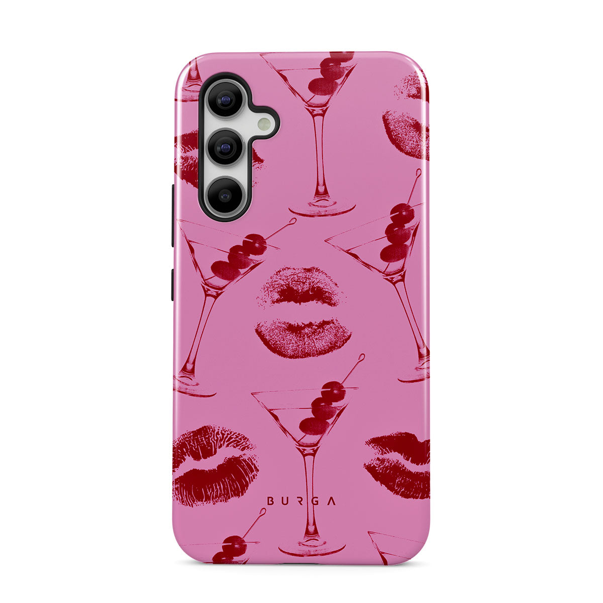 Kenmerken van dit ontwerp: rode lippen, kussen, cocktailglazen, martini's.