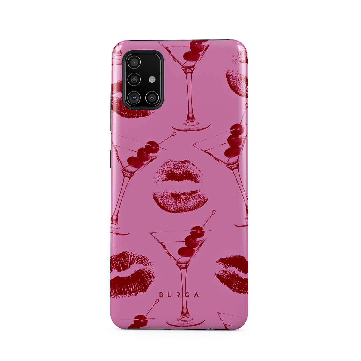Kenmerken van dit ontwerp: rode lippen, kussen, cocktailglazen, martini's.