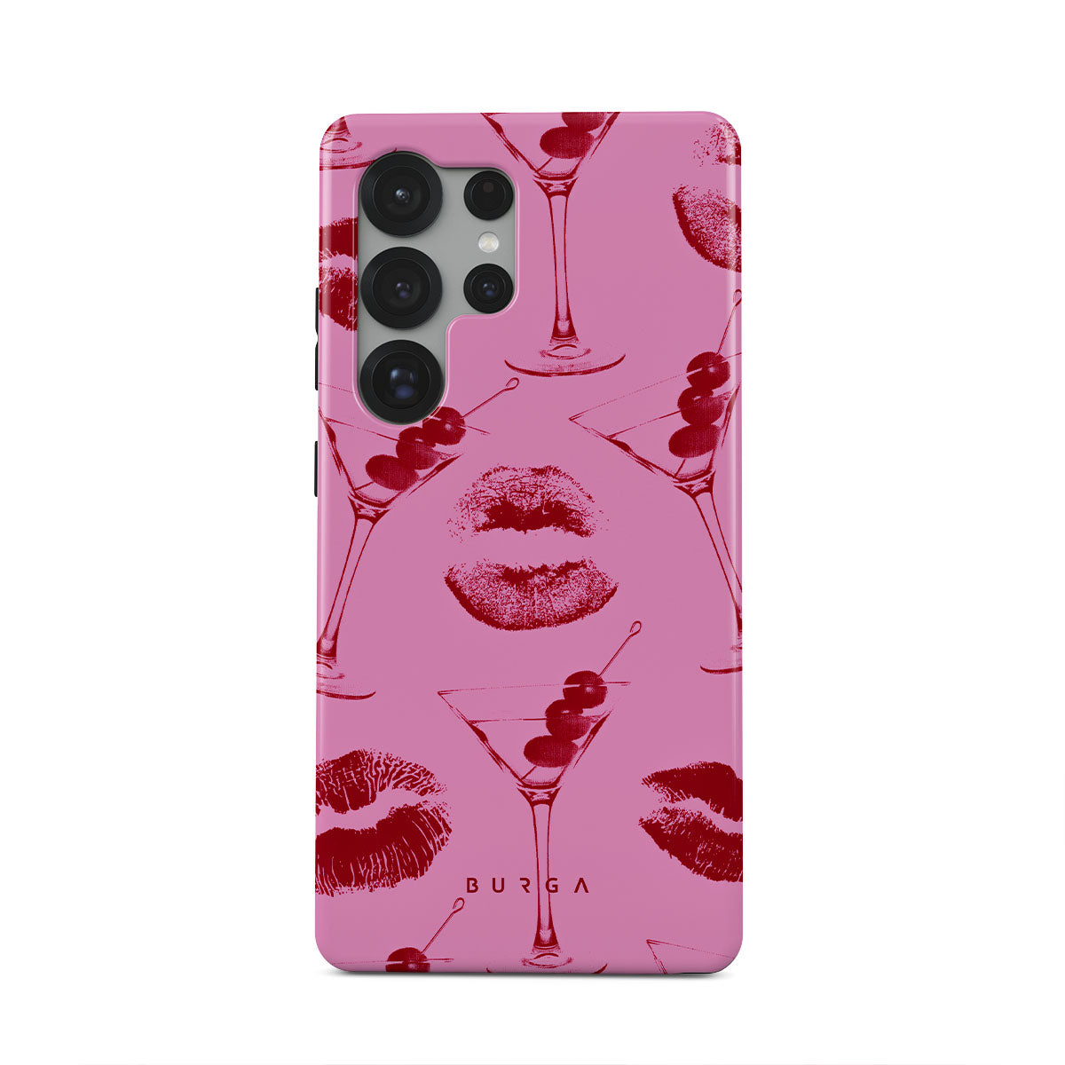 Kenmerken van dit ontwerp: rode lippen, kussen, cocktailglazen, martini's.