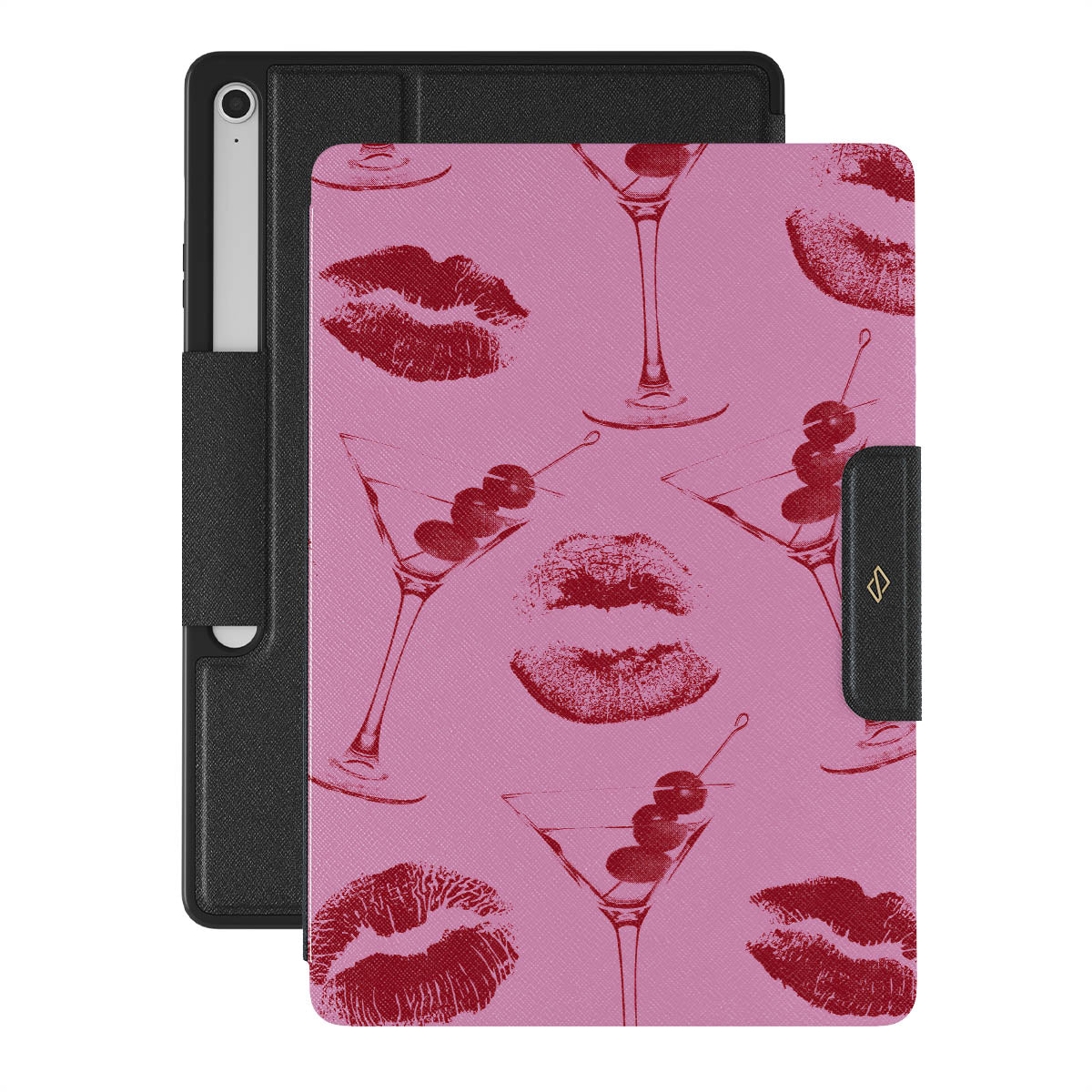 Kenmerken van dit ontwerp: rode lippen, kussen, cocktailglazen, martini's.