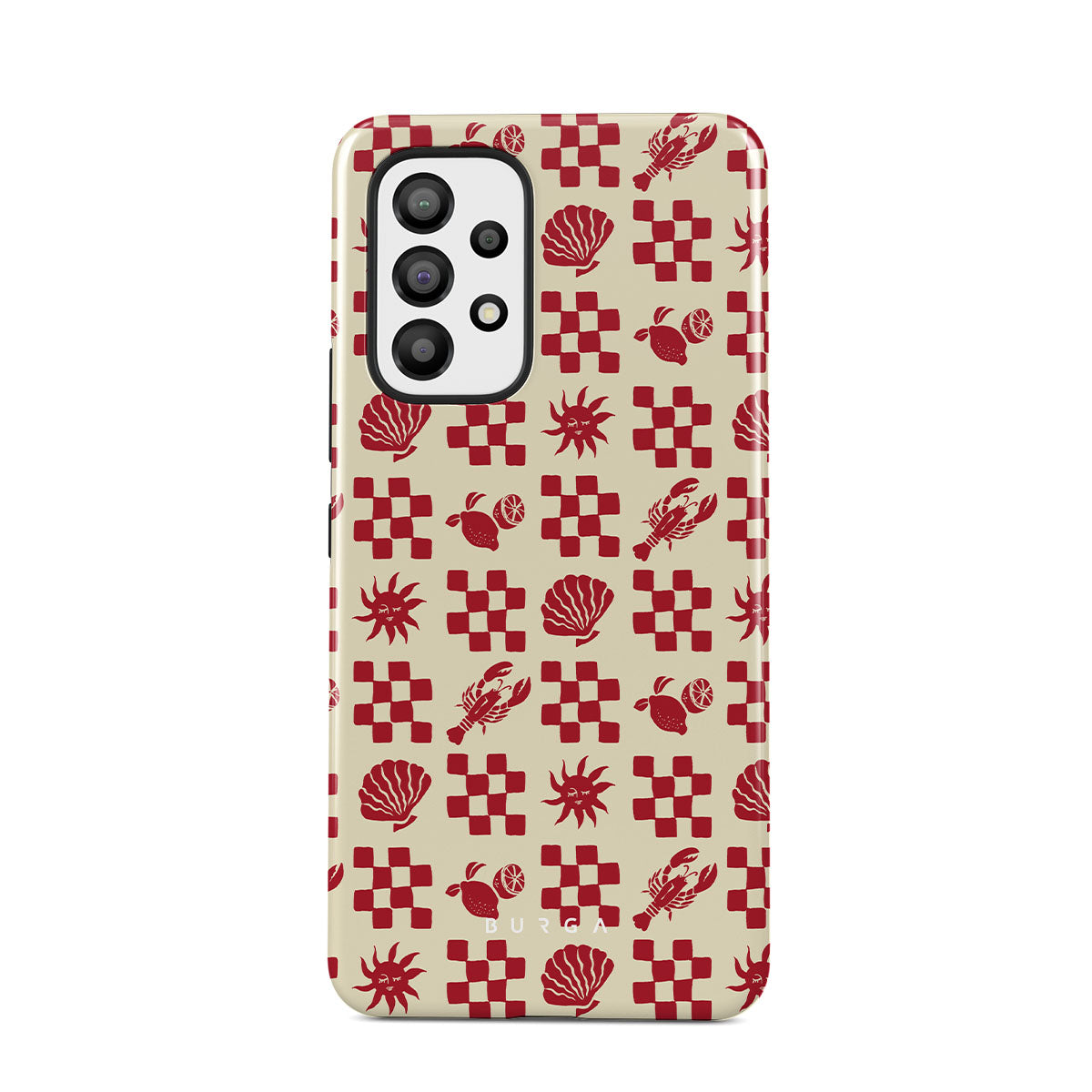 Kenmerken van dit design: Rood geruite patronen, schelpen, kreeft, Italiaanse motieven.