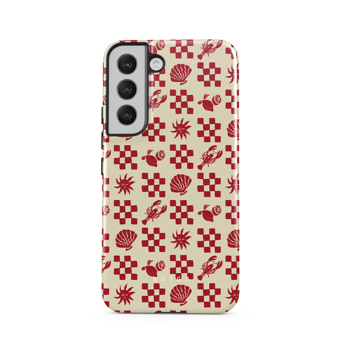 Kenmerken van dit design: Rood geruite patronen, schelpen, kreeft, Italiaanse motieven.