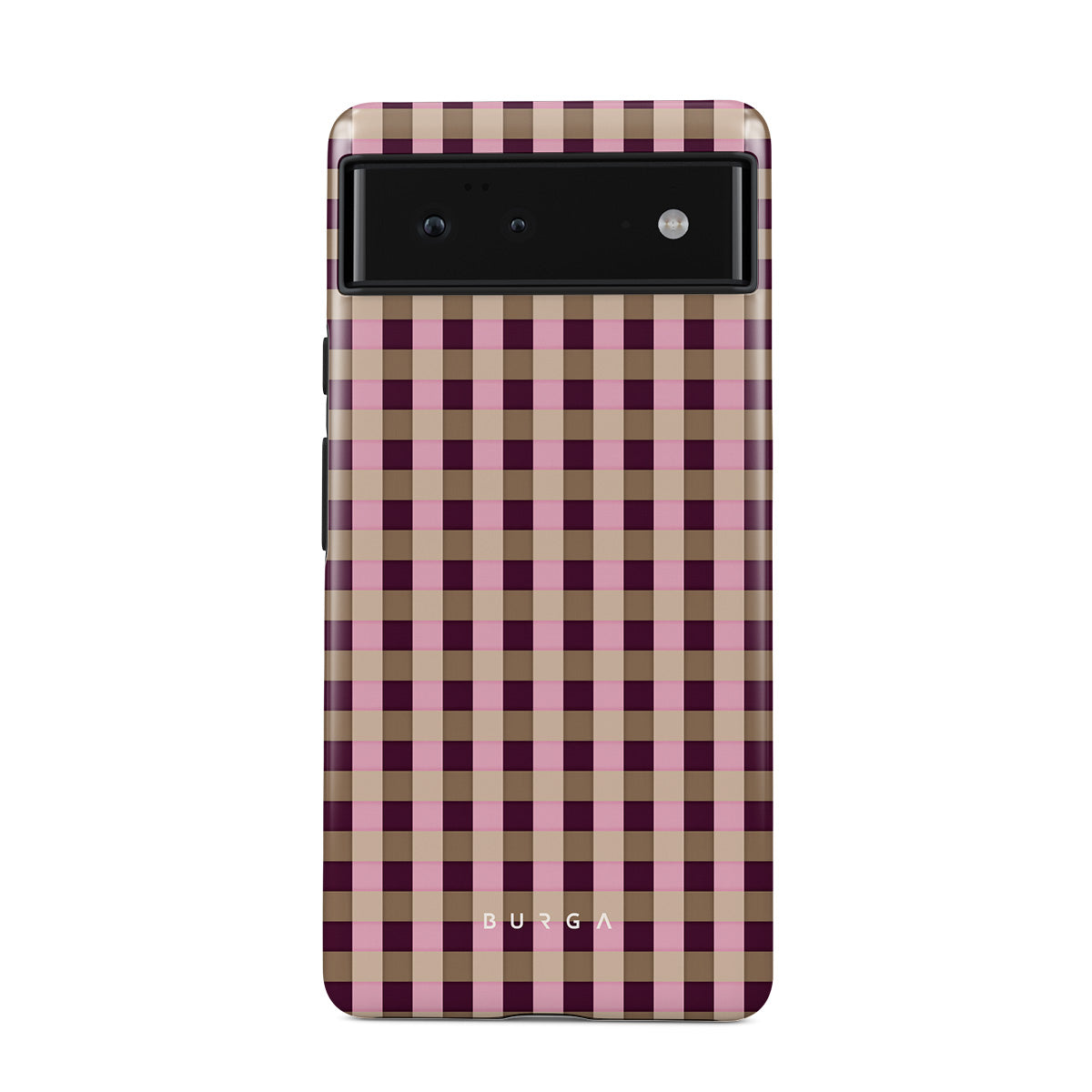 Kenmerken van dit design: een roze en bordeaux geruit patroon in een moderne stijl.