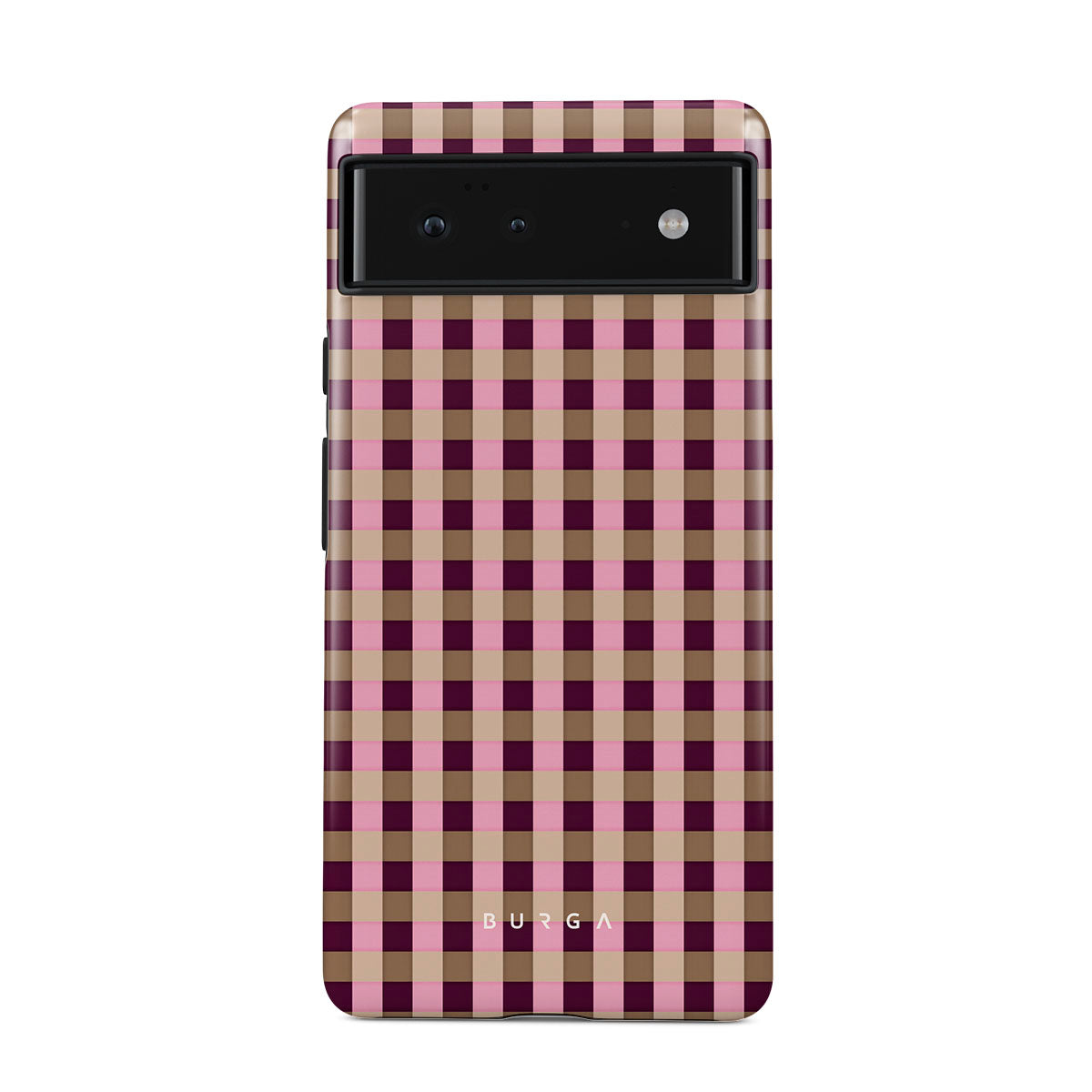 Kenmerken van dit design: een roze en bordeaux geruit patroon in een moderne stijl.