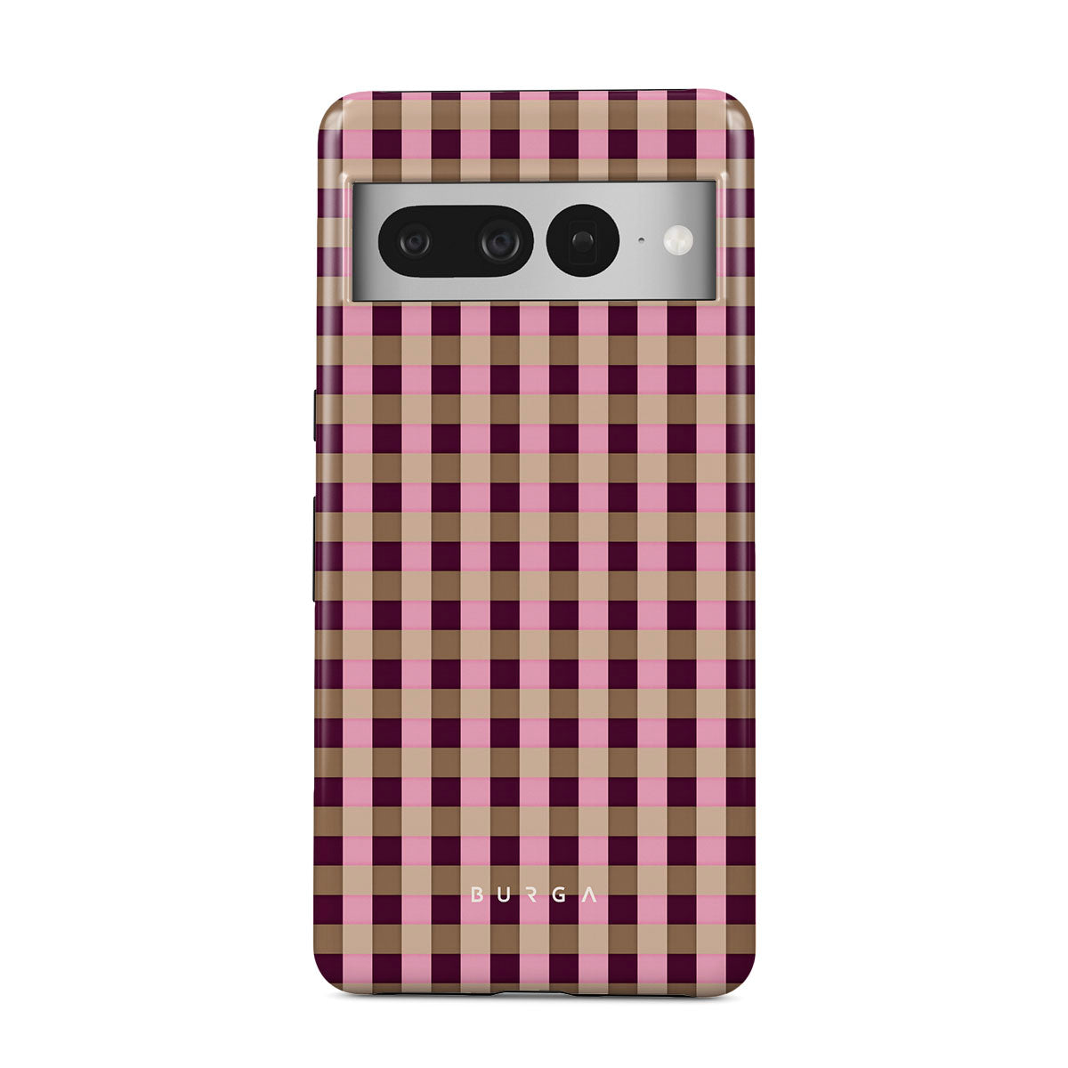 Kenmerken van dit design: een roze en bordeaux geruit patroon in een moderne stijl.