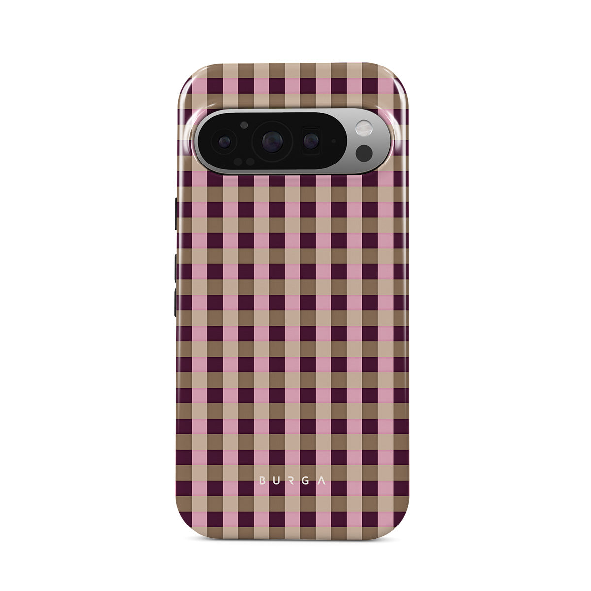 Kenmerken van dit design: een roze en bordeaux geruit patroon in een moderne stijl.