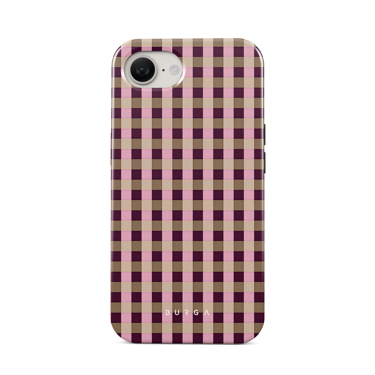 Kenmerken van dit design: een roze en bordeaux geruit patroon in een moderne stijl.