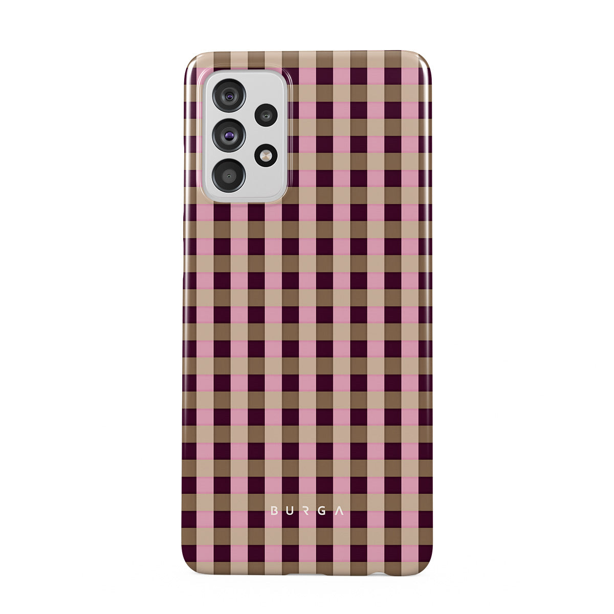 Kenmerken van dit design: een roze en bordeaux geruit patroon in een moderne stijl.
