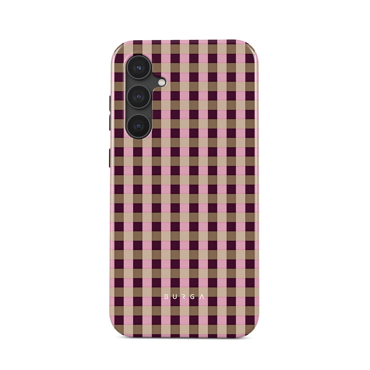 Kenmerken van dit design: een roze en bordeaux geruit patroon in een moderne stijl.