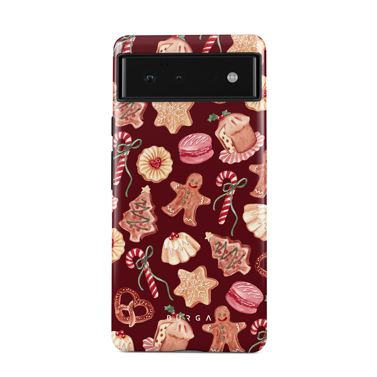 Kenmerken van dit design: kerstkoekjes, peperkoekenmannen, zuurstokken, pepermuntjes, feestelijke zoetigheden, bordeauxrode achtergrond