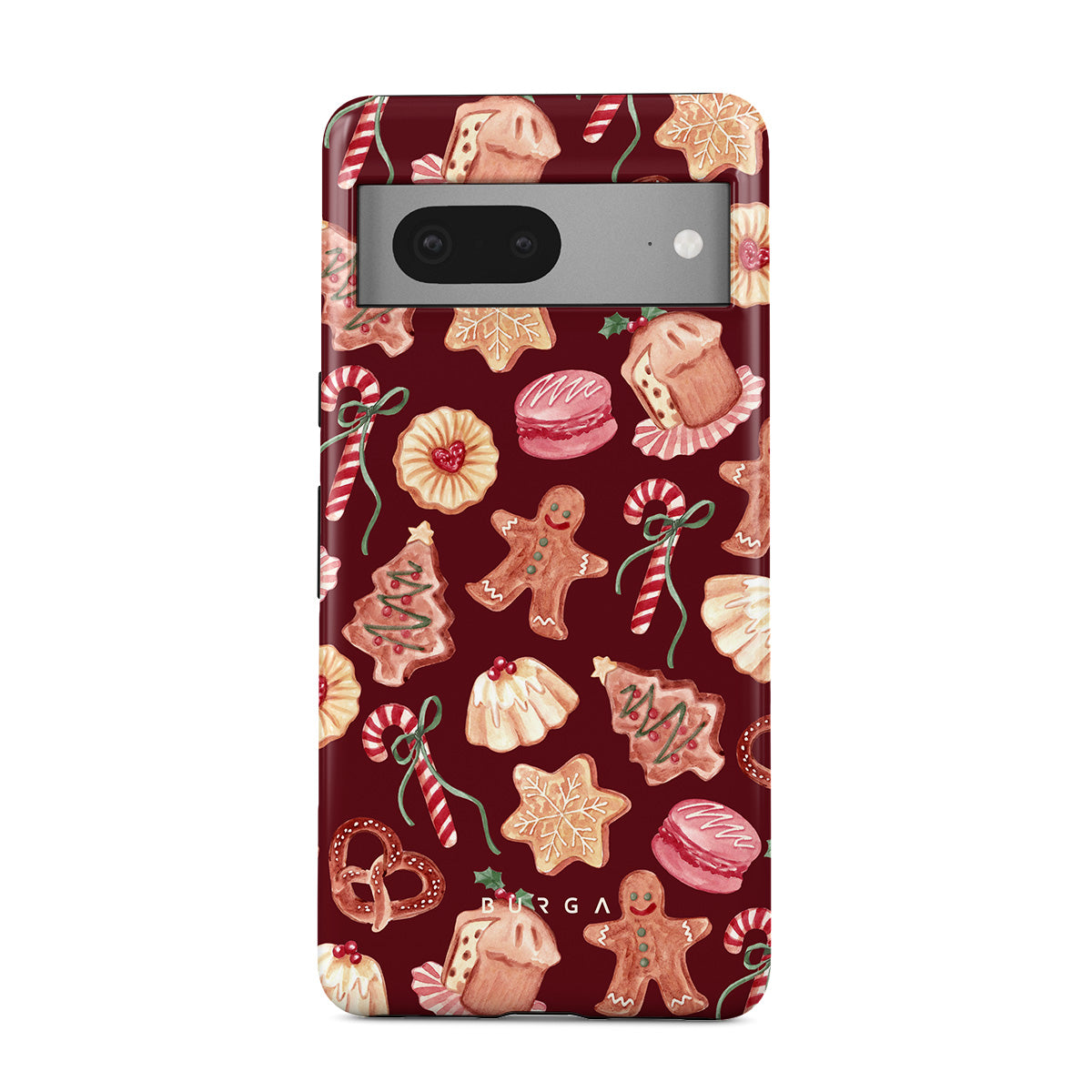 Kenmerken van dit design: kerstkoekjes, peperkoekenmannen, zuurstokken, pepermuntjes, feestelijke zoetigheden, bordeauxrode achtergrond