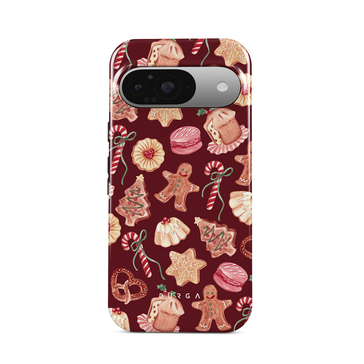 Kenmerken van dit design: kerstkoekjes, peperkoekenmannen, zuurstokken, pepermuntjes, feestelijke zoetigheden, bordeauxrode achtergrond