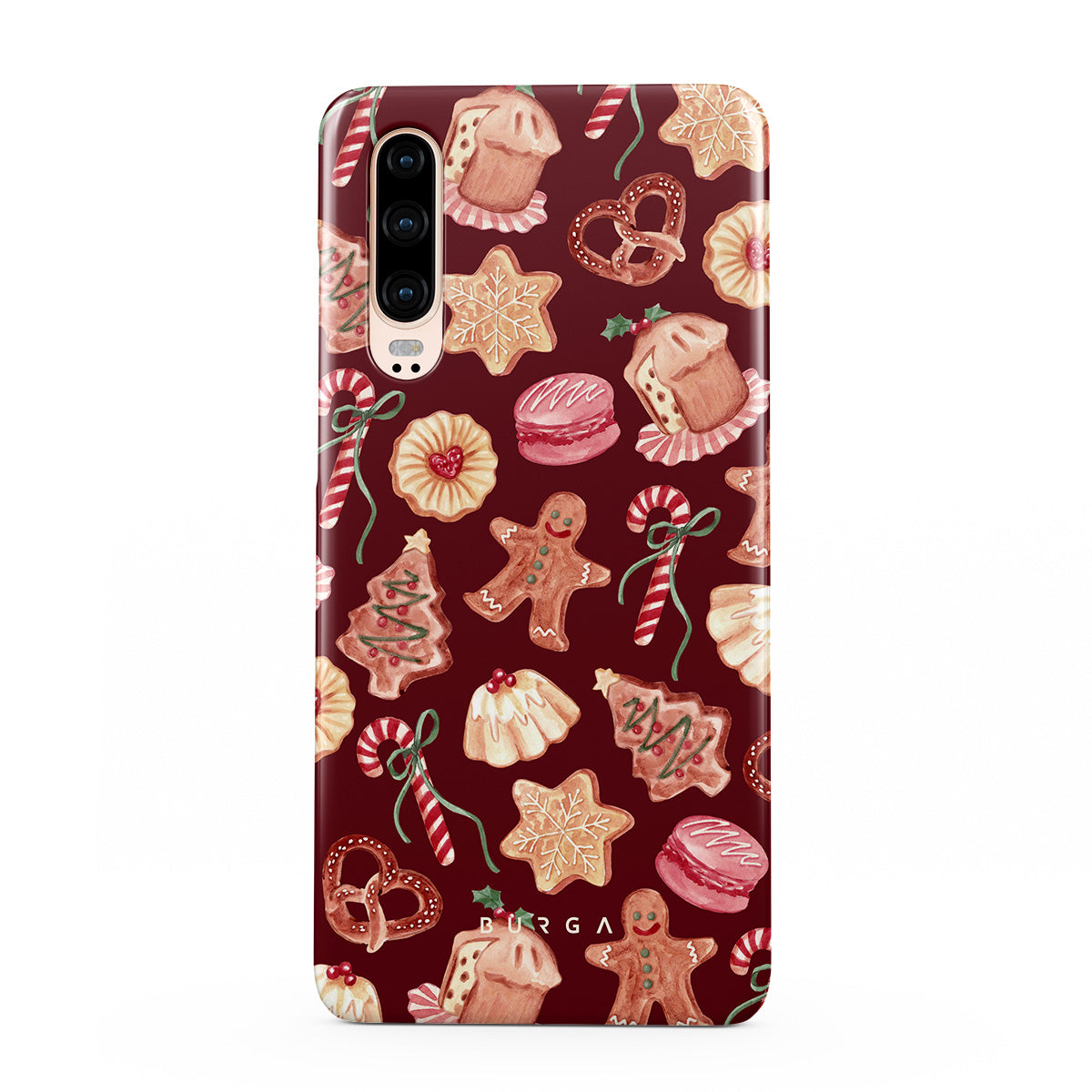 Kenmerken van dit design: kerstkoekjes, peperkoekenmannen, zuurstokken, pepermuntjes, feestelijke zoetigheden, bordeauxrode achtergrond