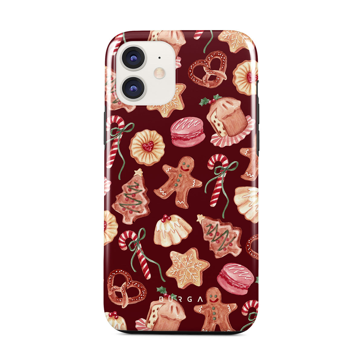 Kenmerken van dit design: kerstkoekjes, peperkoekenmannen, zuurstokken, pepermuntjes, feestelijke zoetigheden, bordeauxrode achtergrond