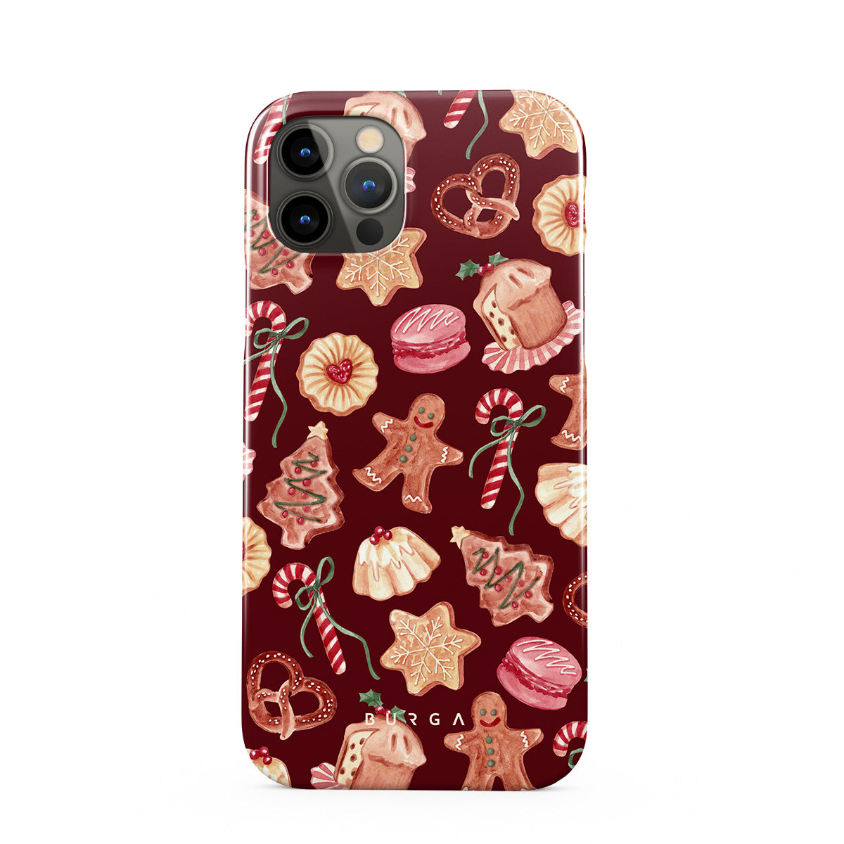 Kenmerken van dit design: kerstkoekjes, peperkoekenmannen, zuurstokken, pepermuntjes, feestelijke zoetigheden, bordeauxrode achtergrond