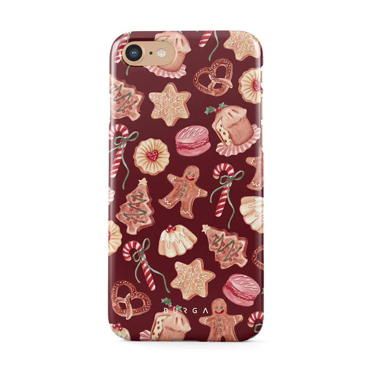 Kenmerken van dit design: kerstkoekjes, peperkoekenmannen, zuurstokken, pepermuntjes, feestelijke zoetigheden, bordeauxrode achtergrond