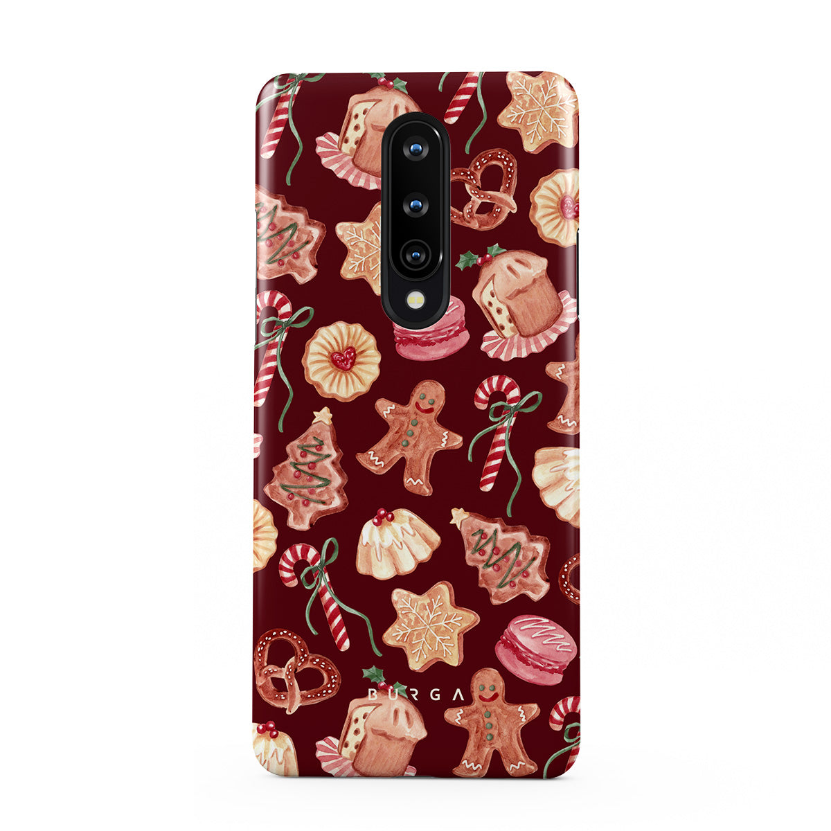 Kenmerken van dit design: kerstkoekjes, peperkoekenmannen, zuurstokken, pepermuntjes, feestelijke zoetigheden, bordeauxrode achtergrond