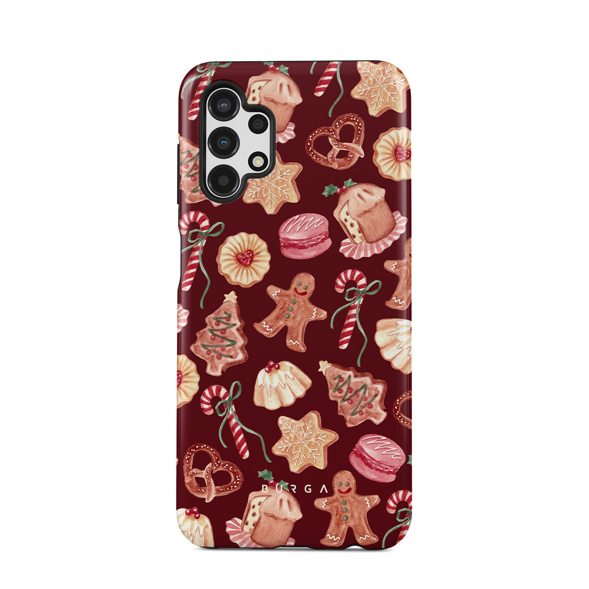 Kenmerken van dit design: kerstkoekjes, peperkoekenmannen, zuurstokken, pepermuntjes, feestelijke zoetigheden, bordeauxrode achtergrond