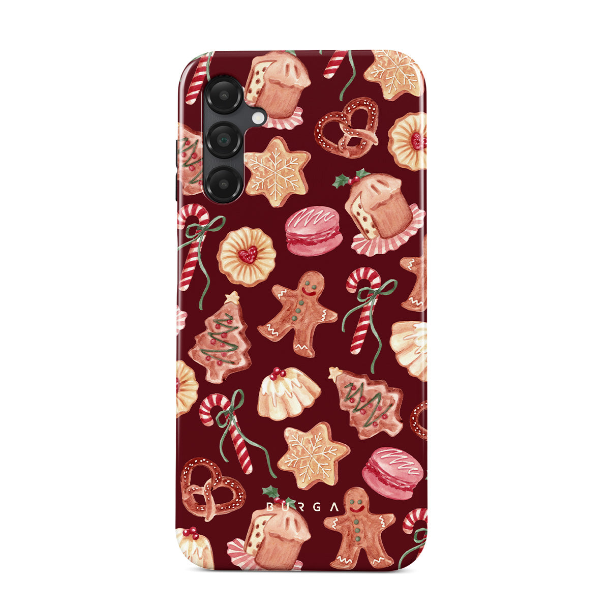 Kenmerken van dit design: kerstkoekjes, peperkoekenmannen, zuurstokken, pepermuntjes, feestelijke zoetigheden, bordeauxrode achtergrond