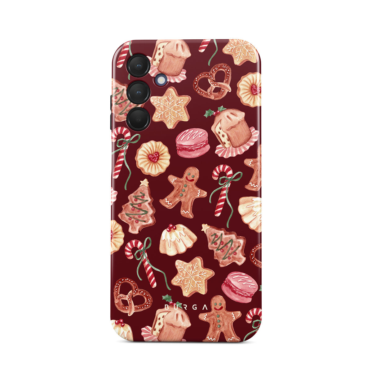 Kenmerken van dit design: kerstkoekjes, peperkoekenmannen, zuurstokken, pepermuntjes, feestelijke zoetigheden, bordeauxrode achtergrond