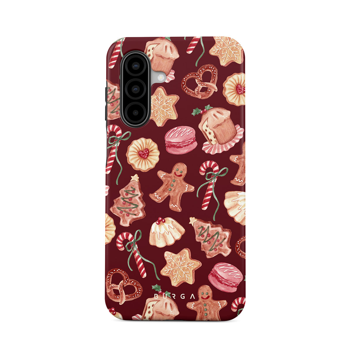 Kenmerken van dit design: kerstkoekjes, peperkoekenmannen, zuurstokken, pepermuntjes, feestelijke zoetigheden, bordeauxrode achtergrond