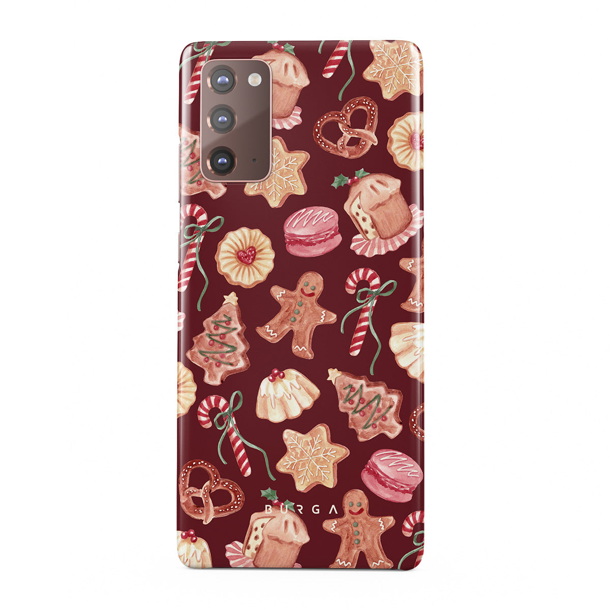 Kenmerken van dit design: kerstkoekjes, peperkoekenmannen, zuurstokken, pepermuntjes, feestelijke zoetigheden, bordeauxrode achtergrond
