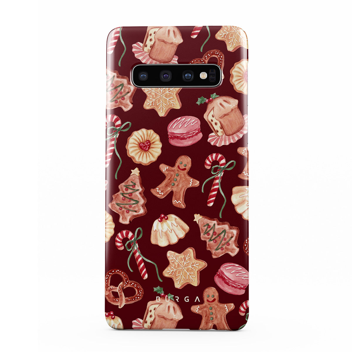 Kenmerken van dit design: kerstkoekjes, peperkoekenmannen, zuurstokken, pepermuntjes, feestelijke zoetigheden, bordeauxrode achtergrond