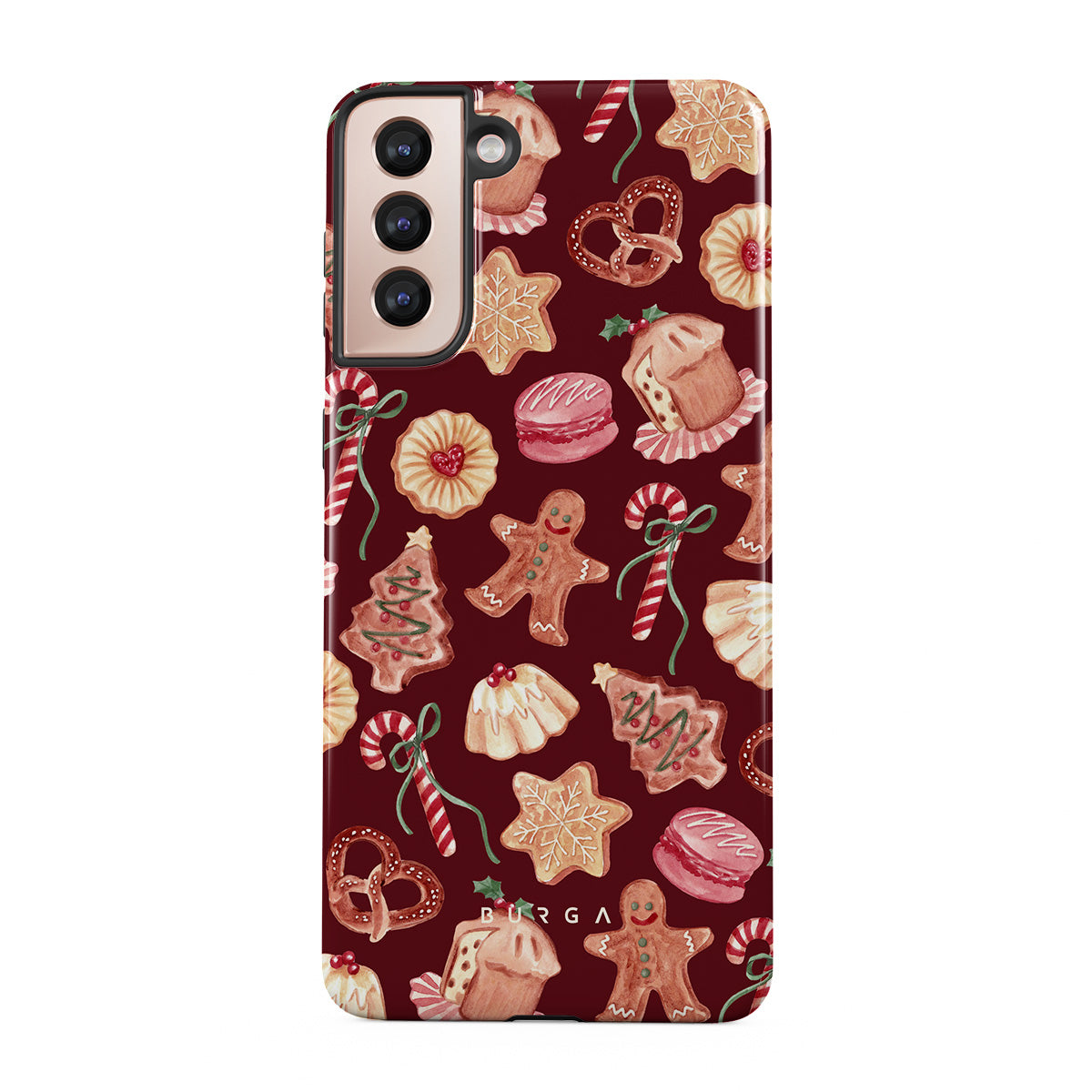 Kenmerken van dit design: kerstkoekjes, peperkoekenmannen, zuurstokken, pepermuntjes, feestelijke zoetigheden, bordeauxrode achtergrond