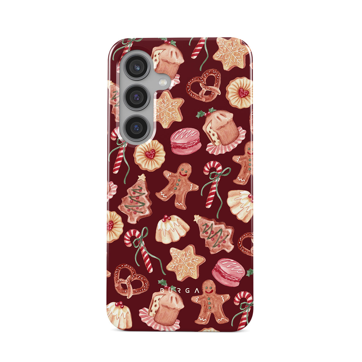 Kenmerken van dit design: kerstkoekjes, peperkoekenmannen, zuurstokken, pepermuntjes, feestelijke zoetigheden, bordeauxrode achtergrond