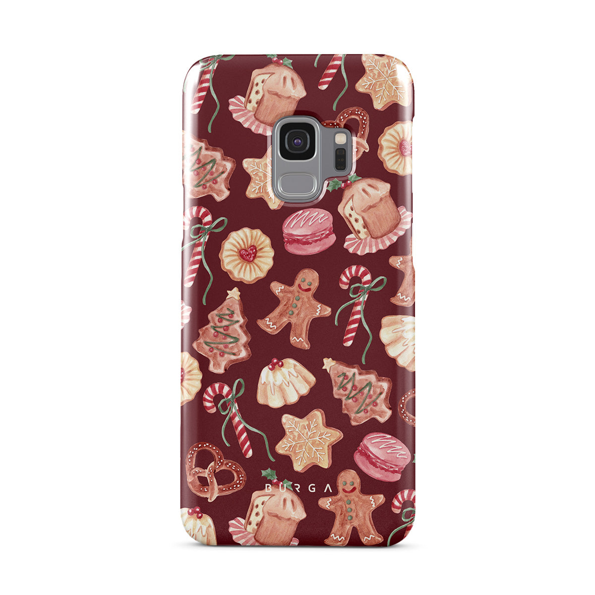Kenmerken van dit design: kerstkoekjes, peperkoekenmannen, zuurstokken, pepermuntjes, feestelijke zoetigheden, bordeauxrode achtergrond