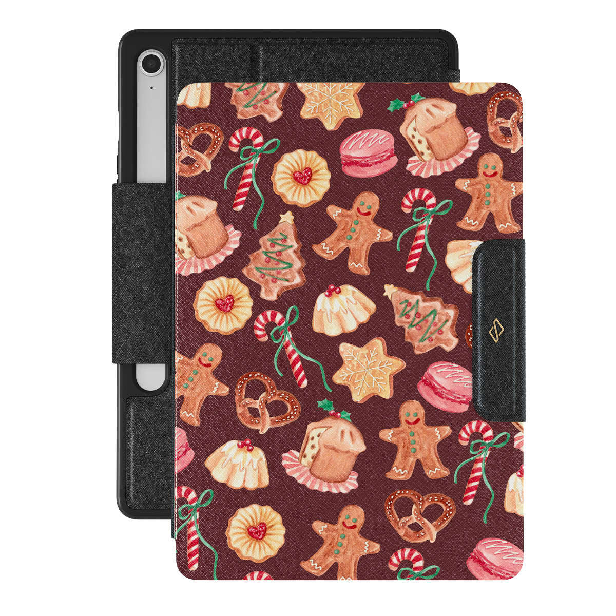 Kenmerken van dit design: kerstkoekjes, peperkoekenmannen, zuurstokken, pepermuntjes, feestelijke zoetigheden, bordeauxrode achtergrond
