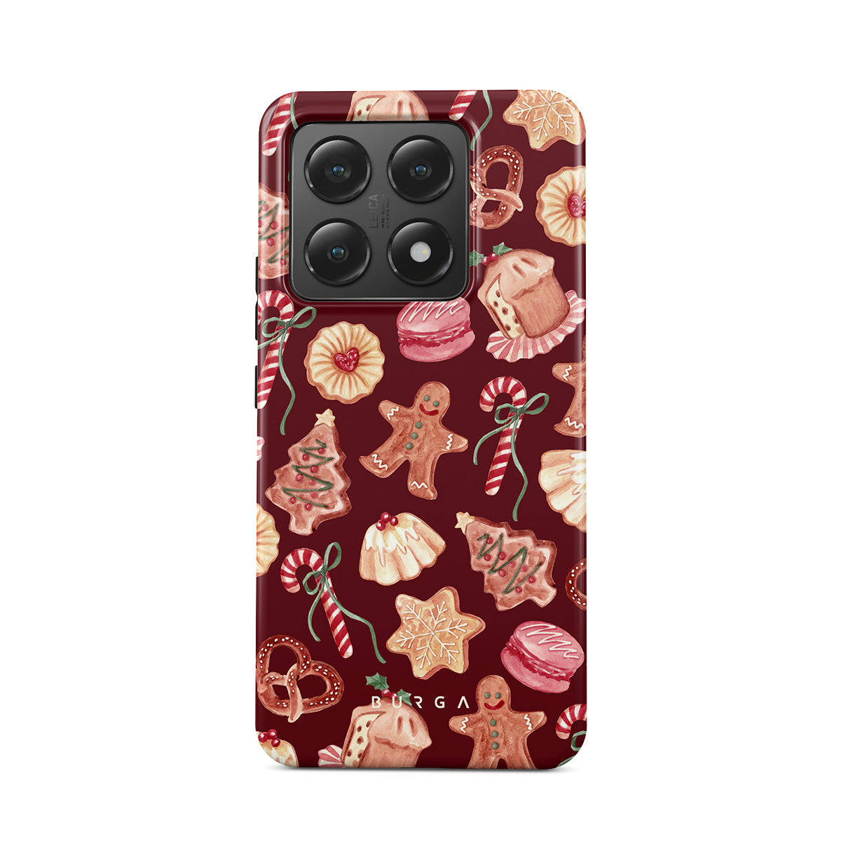 Kenmerken van dit design: kerstkoekjes, peperkoekenmannen, zuurstokken, pepermuntjes, feestelijke zoetigheden, bordeauxrode achtergrond