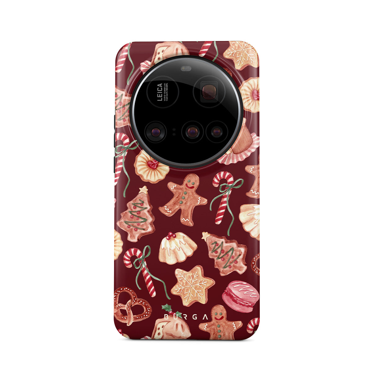 Kenmerken van dit design: kerstkoekjes, peperkoekenmannen, zuurstokken, pepermuntjes, feestelijke zoetigheden, bordeauxrode achtergrond