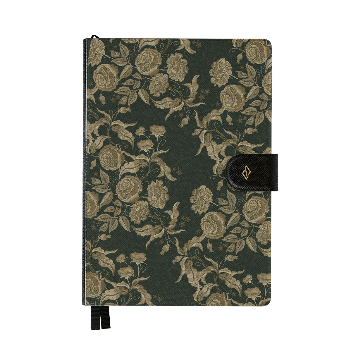 Kenmerken van dit design: vintage rozen, gouden bladeren, diepgroene tinten.