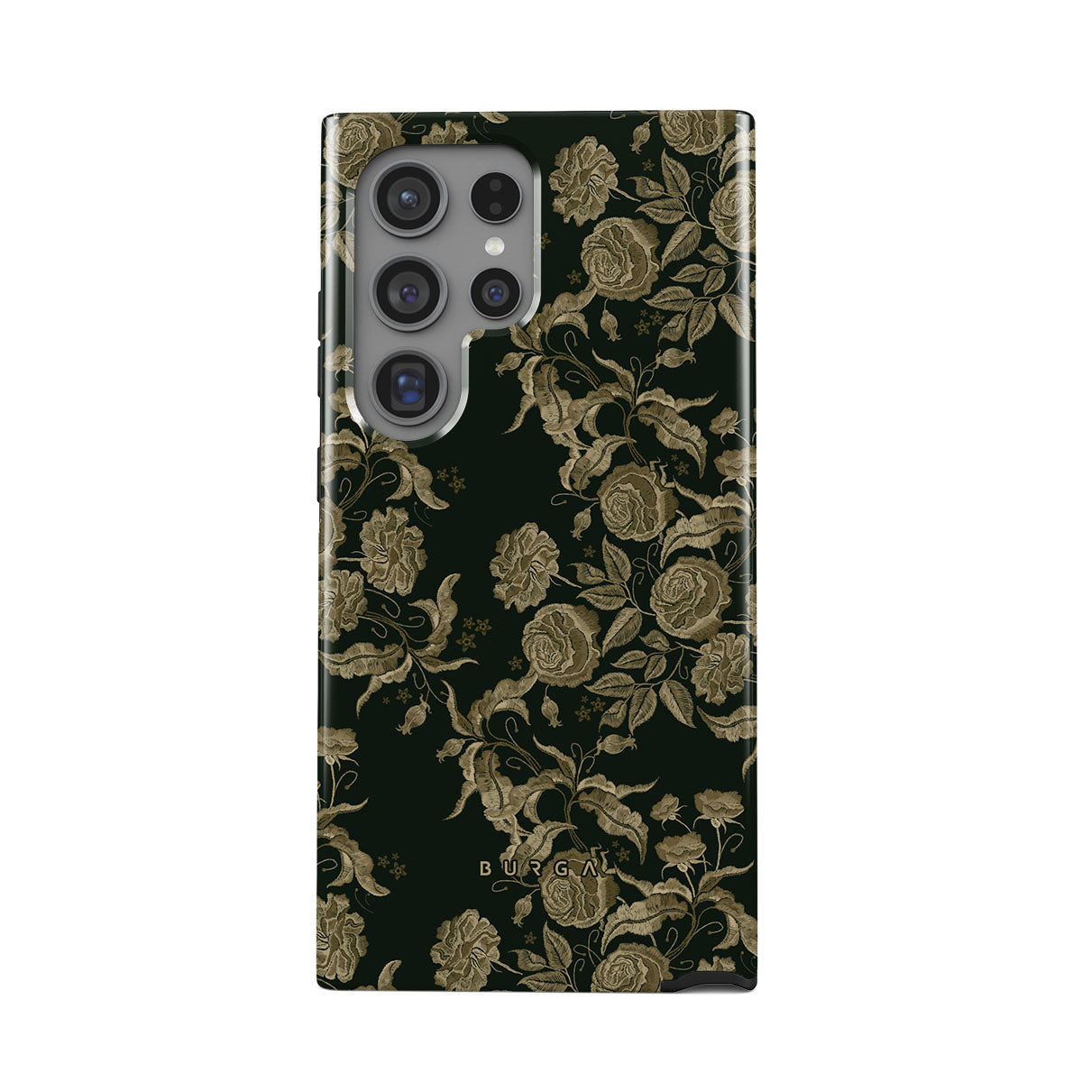 vintage rozen, gouden gebladerte, diepgroene tinten.