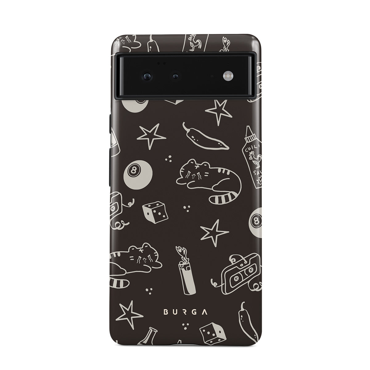 Kenmerken van dit design: bruine achtergrond, speelse droedels, katten, sterren, peper, dobbelstenen, biljartbal, mixtape