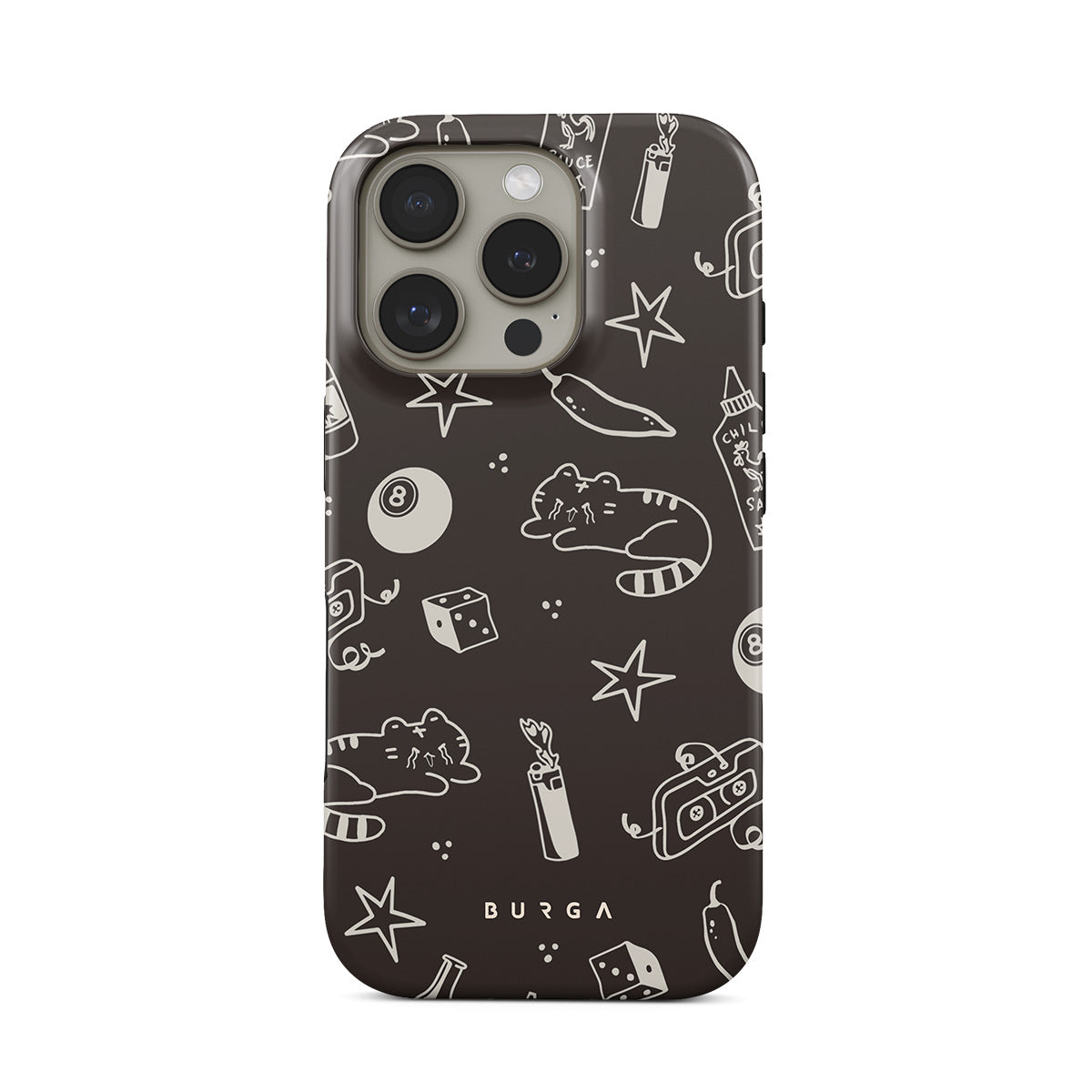 Kenmerken van dit design: bruine achtergrond, speelse droedels, katten, sterren, peper, dobbelstenen, biljartbal, mixtape