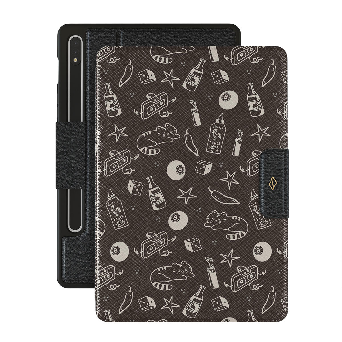 Kenmerken van dit design: bruine achtergrond, speelse droedels, katten, sterren, peper, dobbelstenen, biljartbal, mixtape