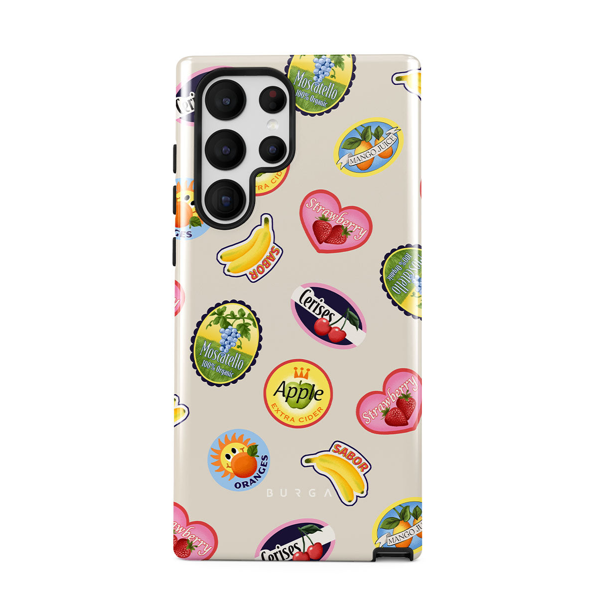 Kenmerken van dit design: Bananen, postzegels, kersen, appels, sinaasappels, aardbeien, felle kleuren, citrusaccenten, fruitmotieven, tropische patronen.