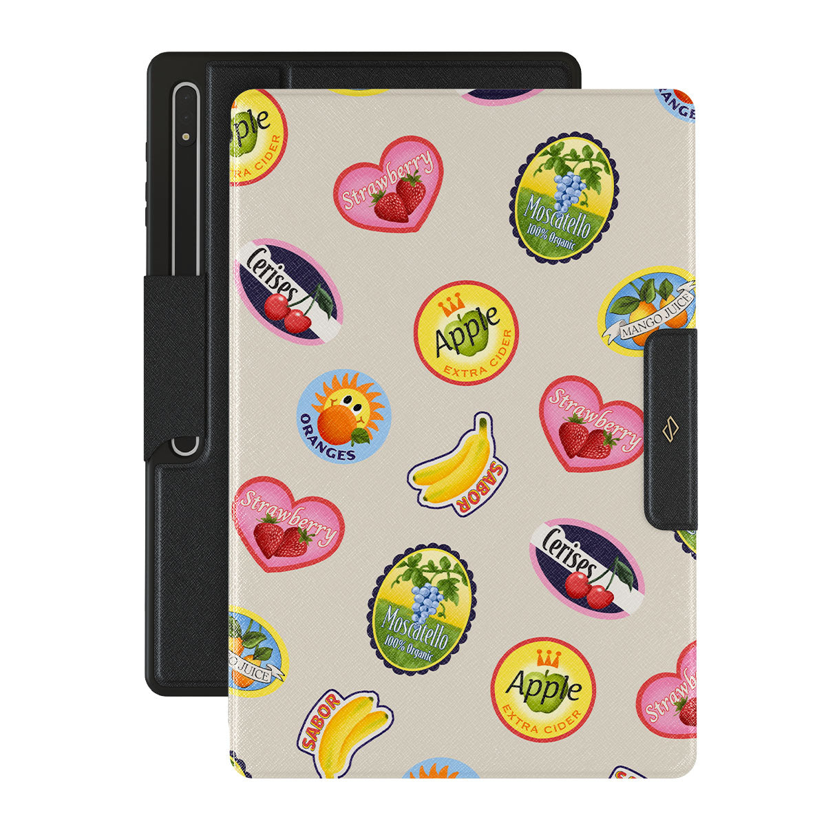 Kenmerken van dit design: Bananen, postzegels, kersen, appels, sinaasappels, aardbeien, felle kleuren, citrusaccenten, fruitmotieven, tropische patronen.