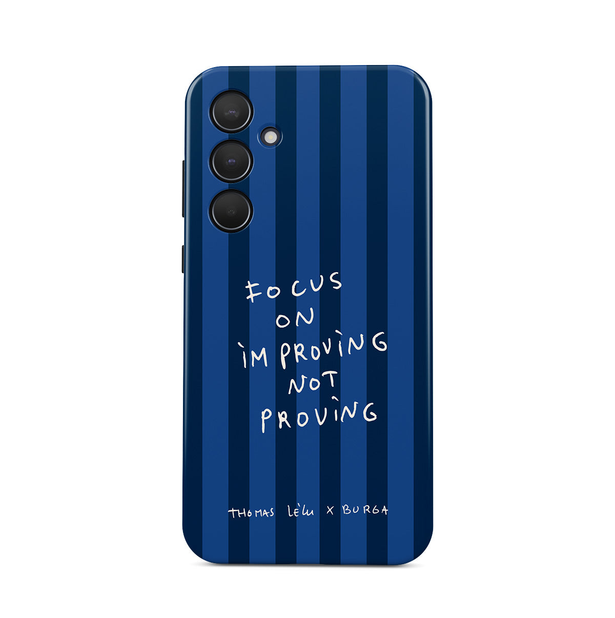 Kenmerken van dit design: handgeschreven tekst, citaat, blauwe strepen