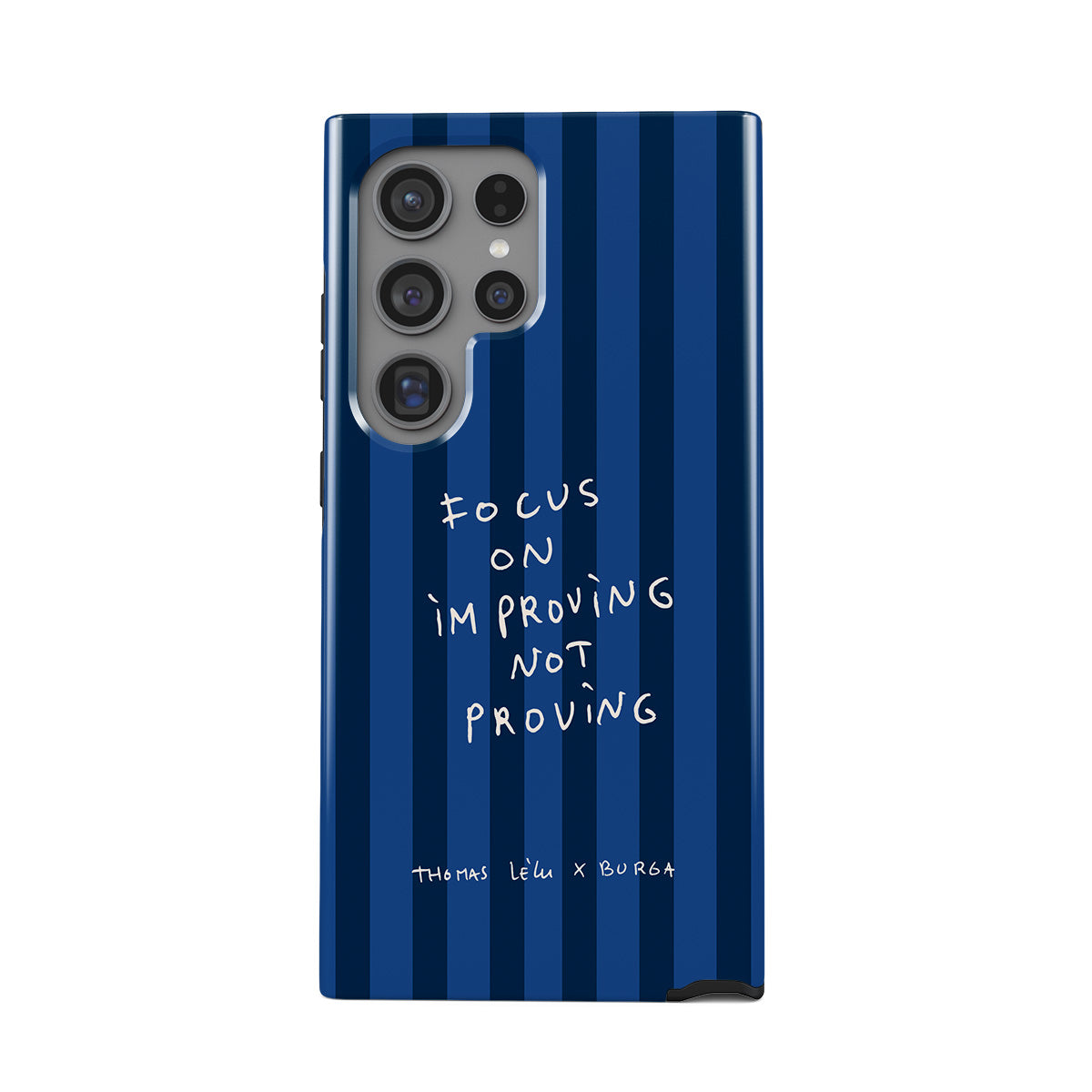 Kenmerken van dit design: handgeschreven tekst, citaat, blauwe strepen