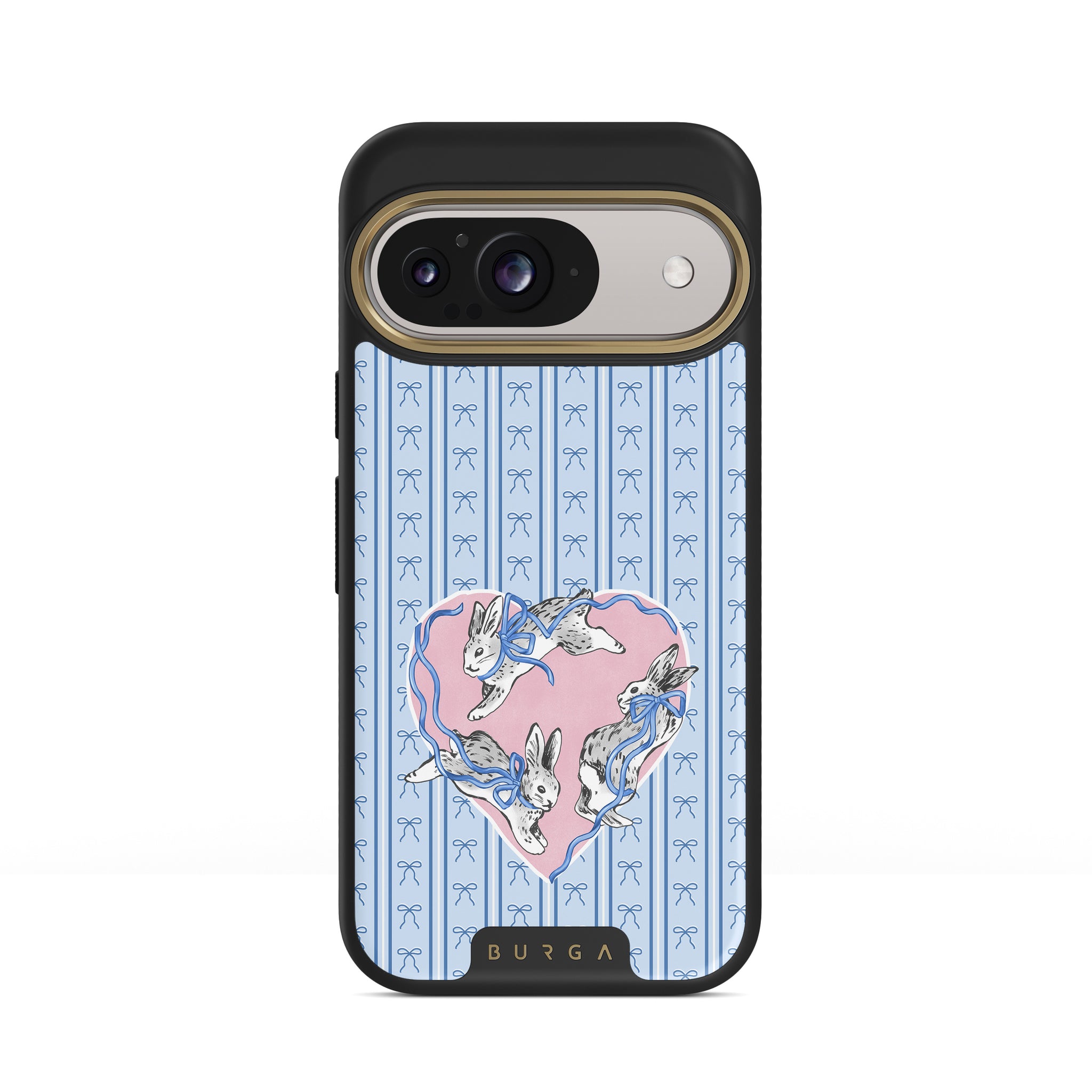 Kenmerken van dit design: witte konijnen, hartenlijst, blauwe strepen