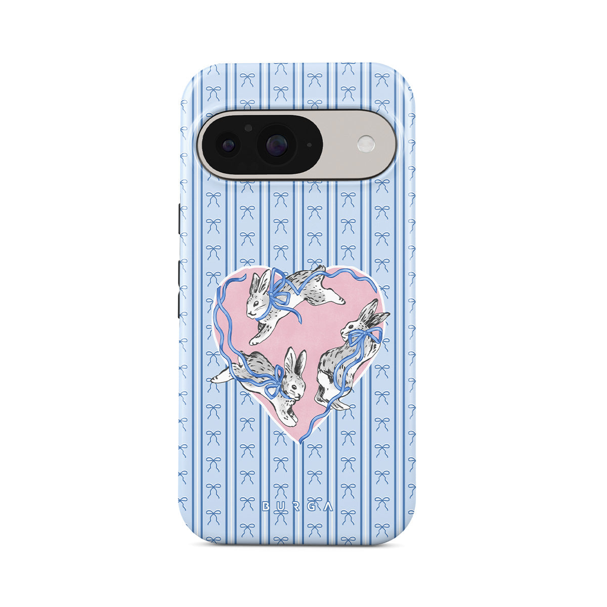 Kenmerken van dit design: witte konijnen, hartenlijst, blauwe strepen