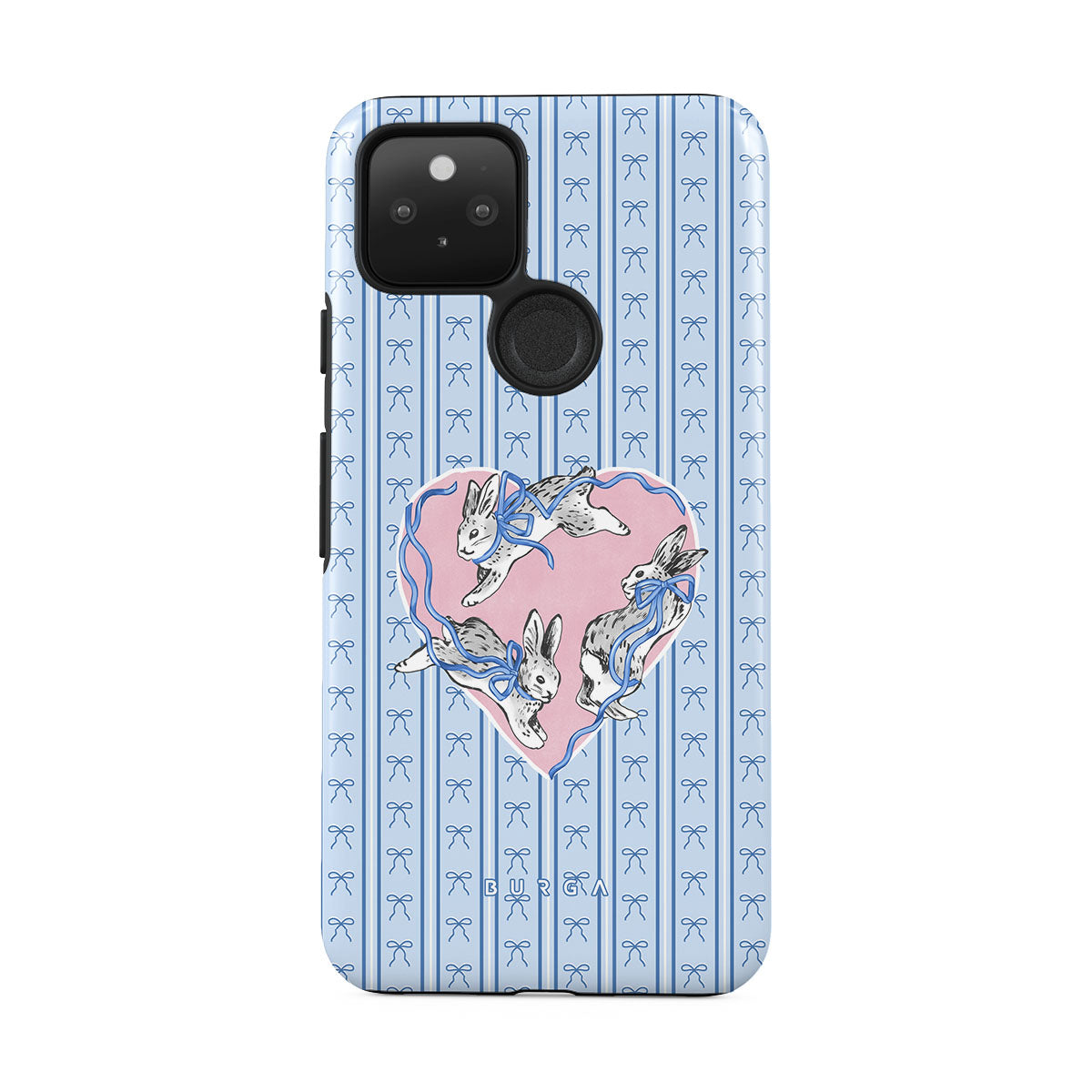 Kenmerken van dit design: witte konijnen, hartenlijst, blauwe strepen