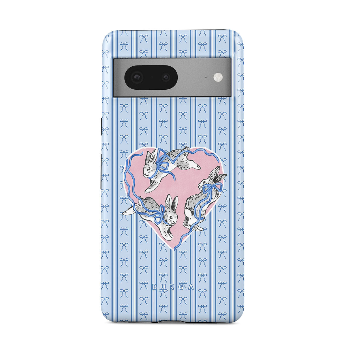 Kenmerken van dit design: witte konijnen, hartenlijst, blauwe strepen