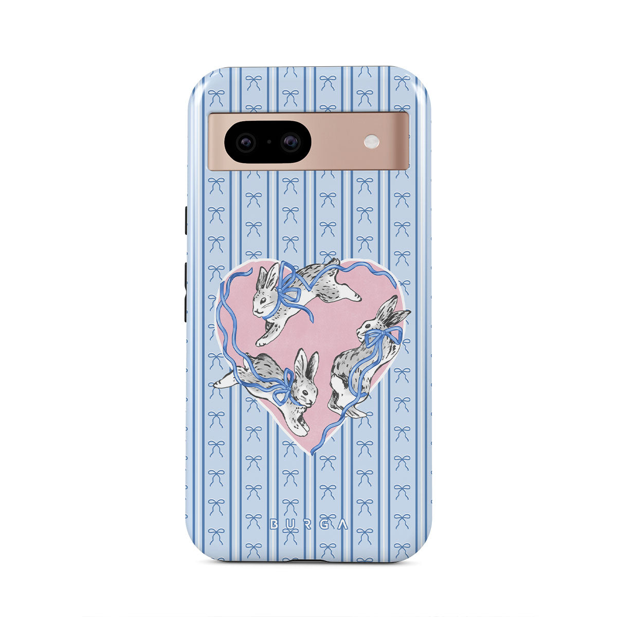 Kenmerken van dit design: witte konijnen, hartenlijst, blauwe strepen