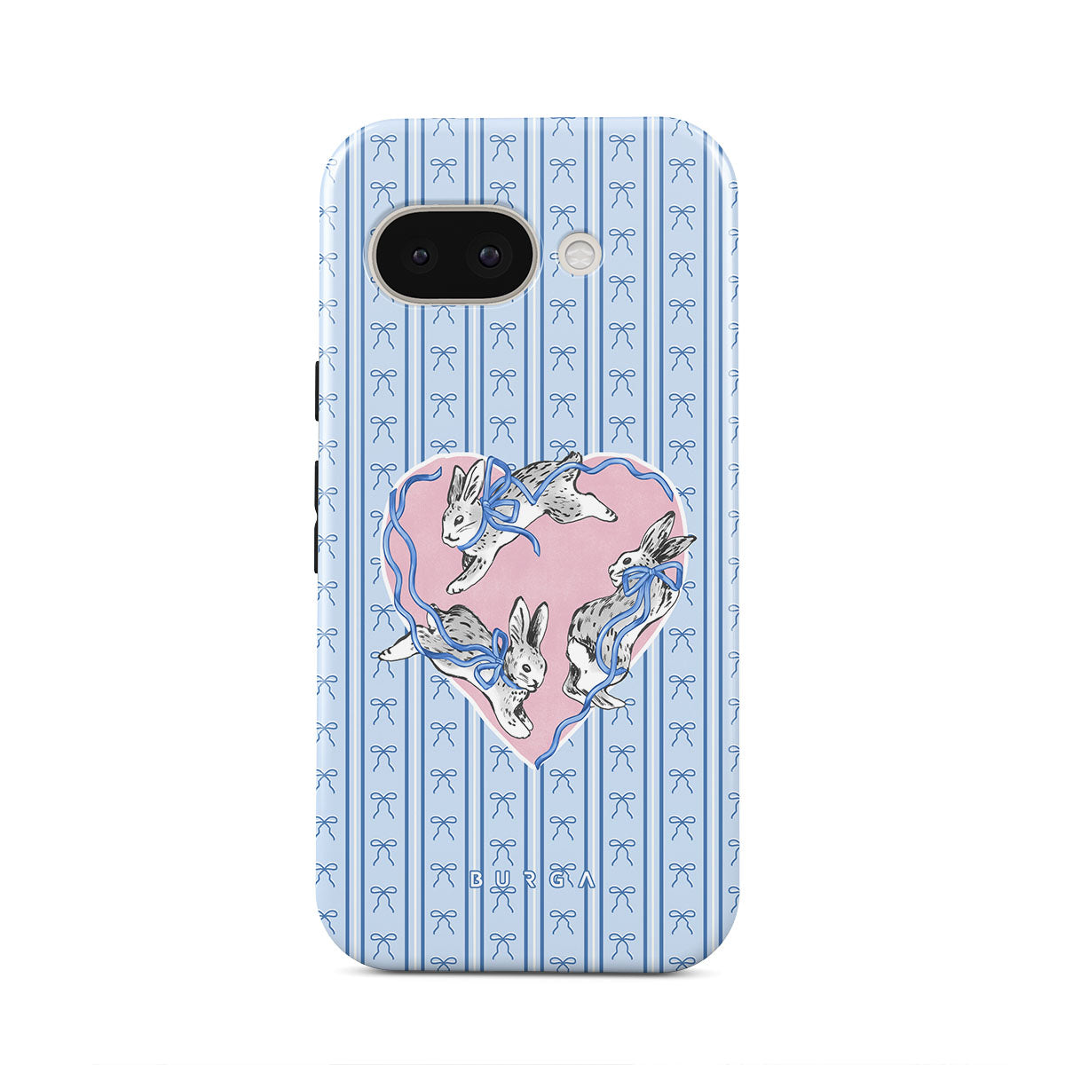 Kenmerken van dit design: witte konijnen, hartenlijst, blauwe strepen